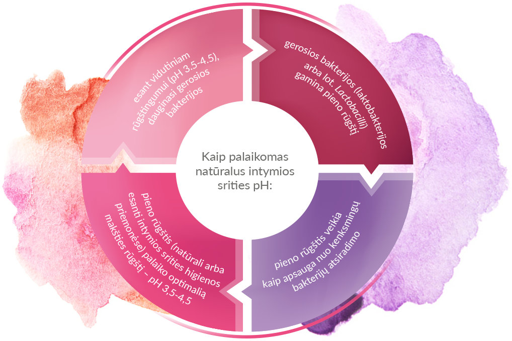 pieno rūgštis (natūrali arba esanti intymios srities higienos priemonėse) palaiko optimalią makšties rūgštį – pH 3,5-4,5